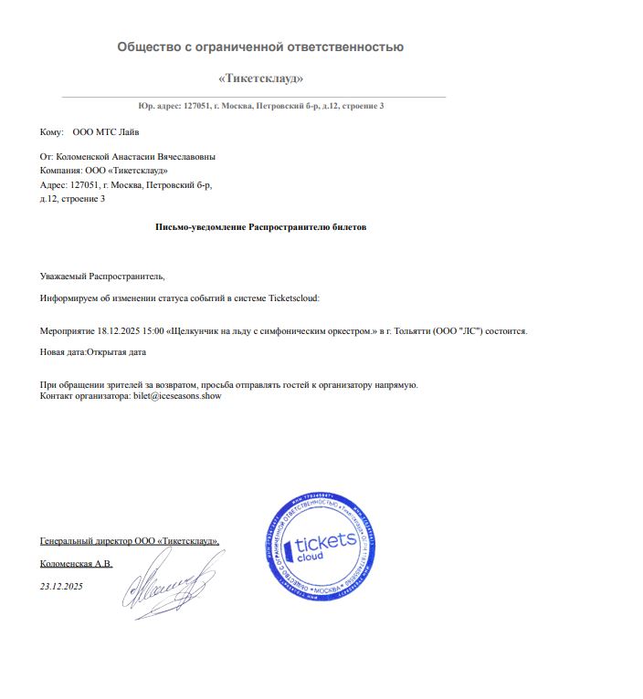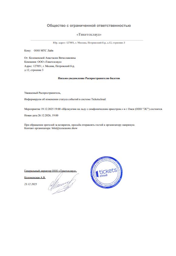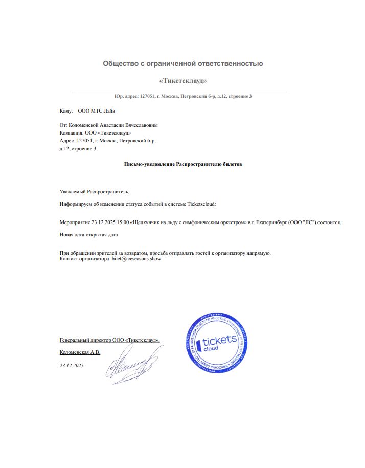 Уважаемый клиент! Спешим сообщить, что по информации, полученной от организатора, сеансы спектакля «Щелкунчик на льду с симфоническим оркестром», запланированные на 23 декабря 2025 года в 15:00 и в 19:00 на УГМК Арене, перенесены на открытые даты. Новые даты сеансов спектаклей будут объявлены дополнительно. Ранее приобретенные билеты действительны на новую дату, обменивать их не нужно. По всем вопросам, пожалуйста, обращайтесь к организатору мероприятия по электронной почте: bilet@iceseasons.show. С уважением, команда поддержки Ticketland.