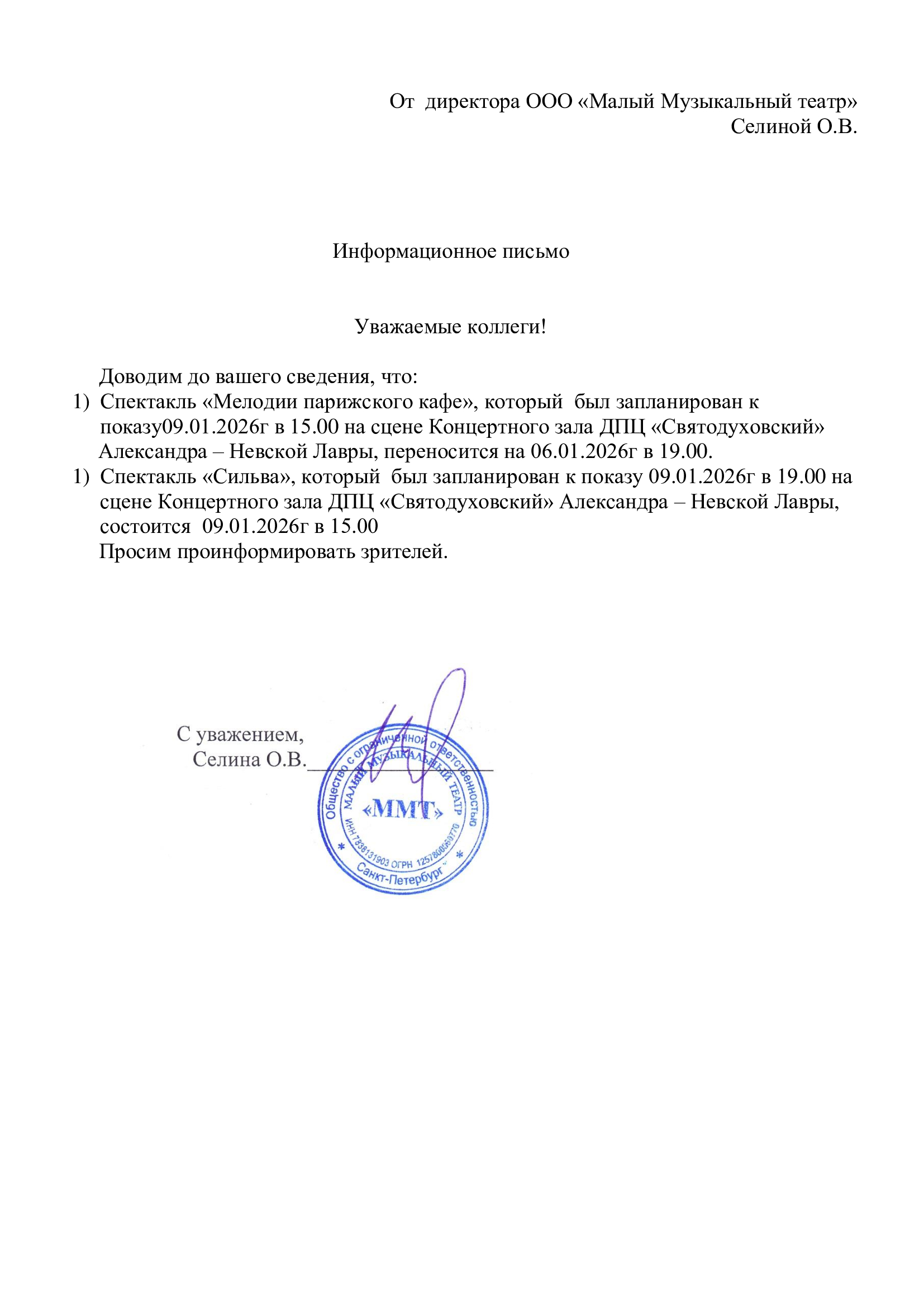 Уважаемый клиент! Спешим сообщить, что по информации, полученной от организатора, Музыкальный спектакль И. Кальмана «Сильва» при свете свечей, запланированный на 9 января 2026 года в 19:00 в Лавре ДПЦ «Святодуховский», перенесён на 15:00. Ранее приобретенные билеты действительны на новое время, обменивать их не нужно. Если вам неудобно посетить спектакль в новое время, вы можете вернуть билет по кнопке в личном кабинете во вкладке «Заказы». Деньги за электронные билеты вернутся автоматически в полном объёме на карту, с которой была произведена оплата. Если вы купили билет в кассе Ticketland.ru за наличный расчет, то обратитесь, пожалуйста, на почту: vozvrat@ticketland.ru. С уважением, команда поддержки Ticketland.