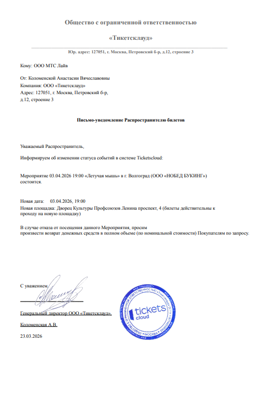 Уважаемый клиент! Спешим сообщить, что по информации, полученной от организатора, спектакль «Летучая мышь», запланированный на 3 апреля в 19:00 в Доме офицеров, переносится во Дворец Культуры Профсоюзов (по адресу: Ленина проспект, 4). Ранее приобретенные билеты действительны на новую площадку, обменивать их не нужно. Если вам не удобно посетить спектакль, вы можете вернуть билет по кнопке в личном кабинете во вкладке «Заказы». Деньги за электронные билеты вернутся автоматически в полном объёме на карту, с которой была произведена оплата. Если вы купили билет в кассе Ticketland.ru за наличный расчет, то обратитесь, пожалуйста, на почту: vozvrat@ticketland.ru. С уважением, команда поддержки Ticketland.