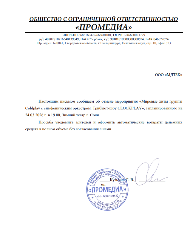 Уважаемый клиент! Спешим сообщить, что по информации, полученной от организатора, трибьют-шоу «Clockplay» «Мировые хиты группы «Coldplay» c симфоническим оркестром», запланированный на 24 марта 2026 года в 19:00 в Зимнем театре, отменён. Деньги за электронные билеты вернутся автоматически в полном объёме на карту, с которой была произведена оплата. Если вы купили билет в кассе Ticketland.ru за наличный расчет или оплатили подарочной картой, то обратитесь, пожалуйста, на почту: vozvrat@ticketland.ru. С уважением, команда поддержки Ticketland.