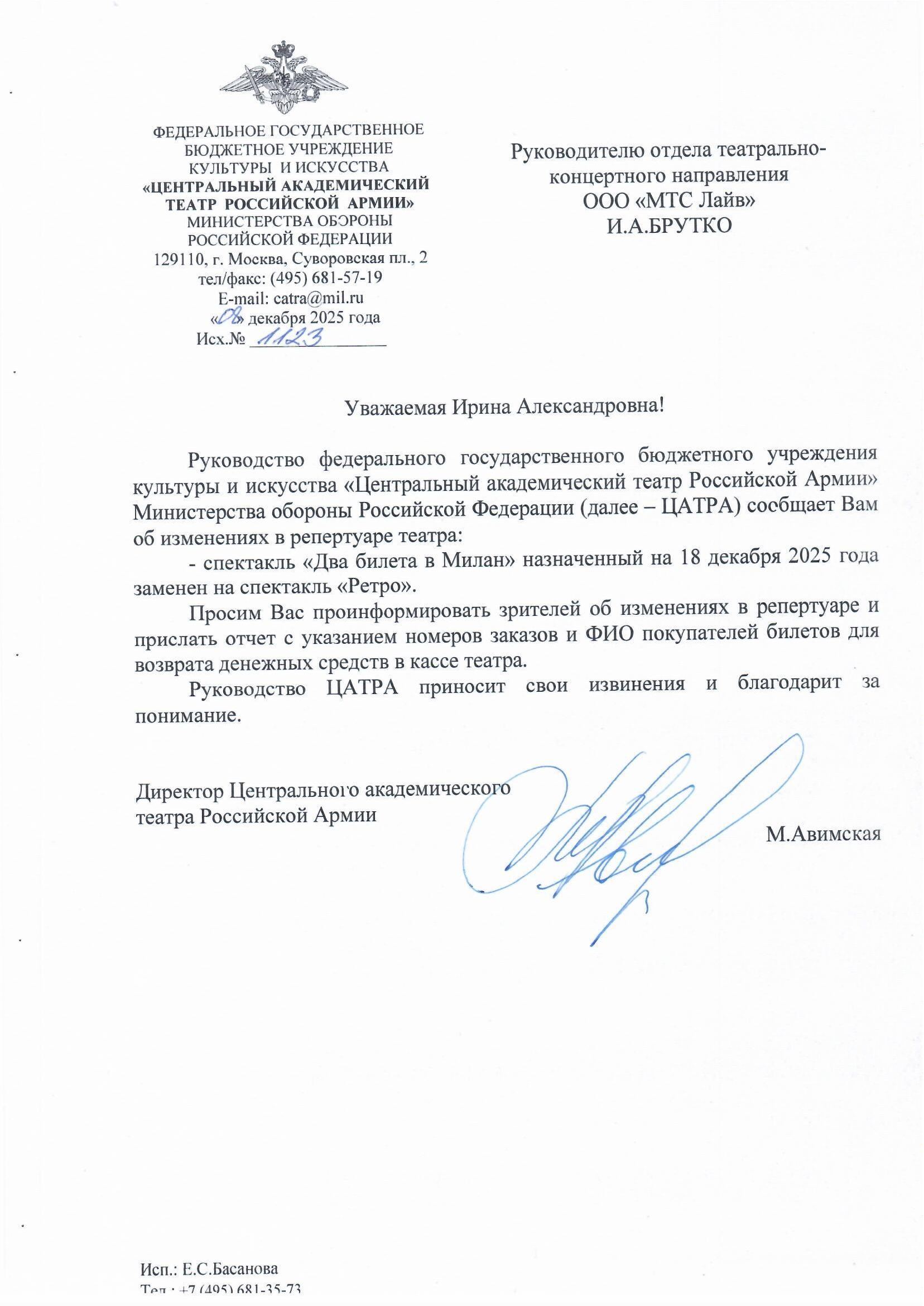 Уважаемый клиент! Спешим сообщить, что по информации, полученной от организатора, спектакль «Два билета в Милан», запланированный на 18 декабря 2025 года в 19:00 в Театре Российской Армии, заменен на спектакль «Ретро». Ранее приобретенные билеты действительны на новый спектакль, обменивать их не нужно. По всем вопросам просьба обращаться в театр по номеру телефона: +7 (495) 681-35-73 и электронной почте: sales@teatrarmii.ru. С уважением, команда поддержки Ticketland.