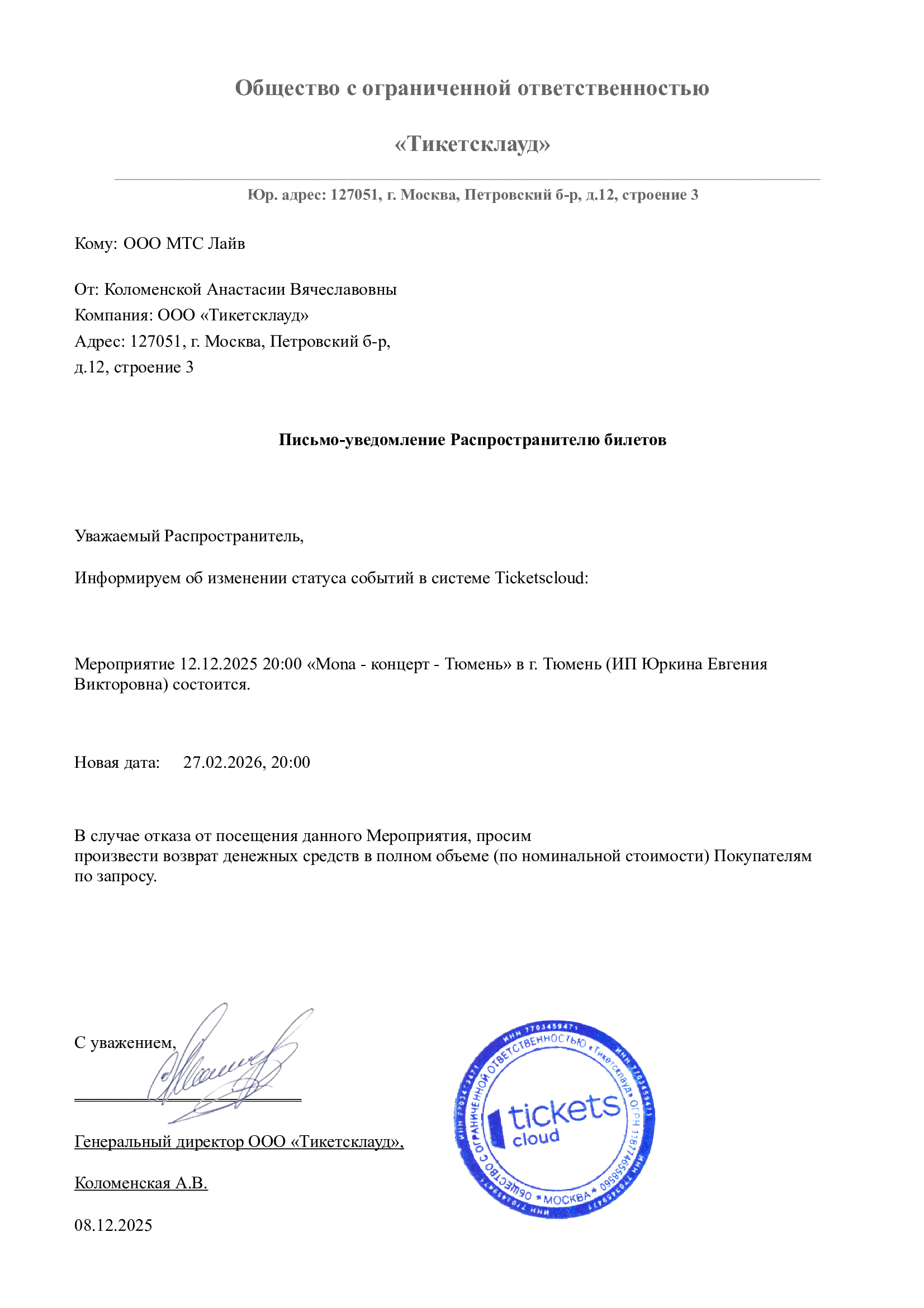 Уважаемый клиент! Спешим сообщить, что по информации, полученной от организатора, концерт Mona, запланированный на 12 декабря 2025 года в 20:00 в Глав клуб (ex. Дом культуры), перенесён на 27 февраля 2026 года, начало в 20:00. Ранее приобретенные билеты действительны на новую дату, обменивать их не нужно. Если вам неудобно посетить концерт в новую дату, вы можете вернуть билет по кнопке в личном кабинете во вкладке «Заказы». Деньги за электронные билеты вернутся автоматически в полном объёме на карту, с которой была произведена оплата. Если вы купили билет в кассе Ticketland.ru за наличный расчет, то обратитесь, пожалуйста, на почту: vozvrat@ticketland.ru. С уважением, команда поддержки Ticketland.