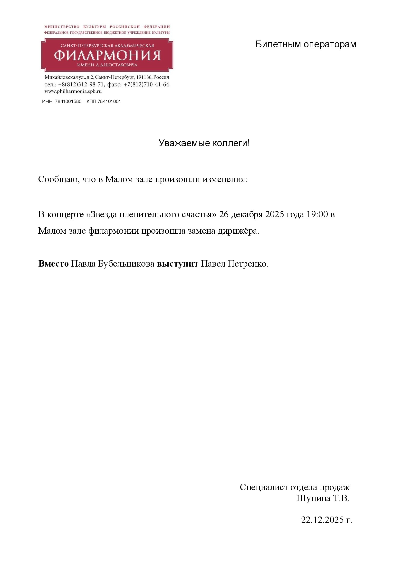 Уважаемый клиент! Спешим сообщить, что по информации, полученной от организатора, у концерта «Звезда пленительного счастья», запланированного на 26 декабря 2025 года в 19:00 в малом зале филармонии, произошла замена дирижера. Вместо Павла Бубельникова выступит Павел Петренко. Ранее приобретенные билеты действительны, обменивать их не нужно. Если новые условия вас не устраивают, вы можете вернуть билет по кнопке в личном кабинете во вкладке «Заказы». Деньги за электронные билеты вернутся автоматически в полном объёме на карту, с которой была произведена оплата. Если вы купили билет в кассе Ticketland.ru за наличный расчет, то обратитесь, пожалуйста, на почту: vozvrat@ticketland.ru. С уважением, команда поддержки Ticketland.