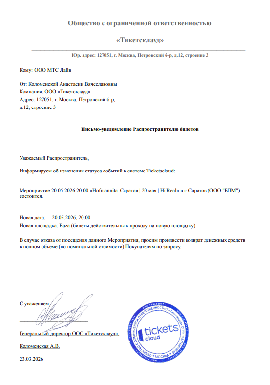 Уважаемый клиент! Спешим сообщить, что по информации, полученной от организатора, концерт Hofmannita, запланированный на 20 мая в 20:00 в пространстве «Hi-Real Production», переносится в Baza. Ранее приобретенные билеты действительны на новую площадку, обменивать их не нужно. Если вам не удобно посетить спектакль, вы можете вернуть билет по кнопке в личном кабинете во вкладке «Заказы». Деньги за электронные билеты вернутся автоматически в полном объёме на карту, с которой была произведена оплата. Если вы купили билет в кассе Ticketland.ru за наличный расчет, то обратитесь, пожалуйста, на почту: vozvrat@ticketland.ru. С уважением, команда поддержки Ticketland.