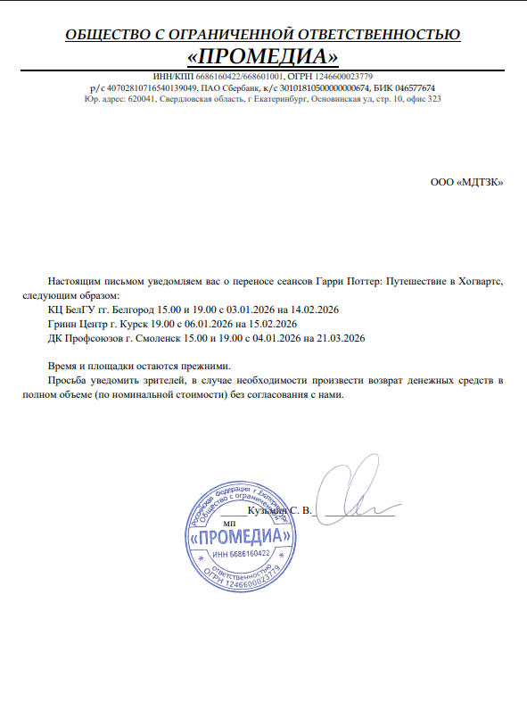 Уважаемый клиент! Спешим сообщить, что по информации, полученной от организатора, концерт «Гарри Поттер: Путешествие в Хогвартс», запланированный на 19.00 04.01.2026, переносится на 21.03.2026 в 19:00 в Областном Дворце культуры профсоюзов. Ранее приобретенные билеты действительны, обменивать их не нужно. Если новые условия вас не устраивают, вы можете вернуть билет по кнопке в личном кабинете во вкладке «Заказы». Деньги за электронные билеты вернутся автоматически в полном объёме на карту, с которой была произведена оплата. Если вы купили билет в кассе Ticketland.ru за наличный расчет, то обратитесь, пожалуйста, на почту: vozvrat@ticketland.ru. С уважением, команда поддержки Ticketland.
