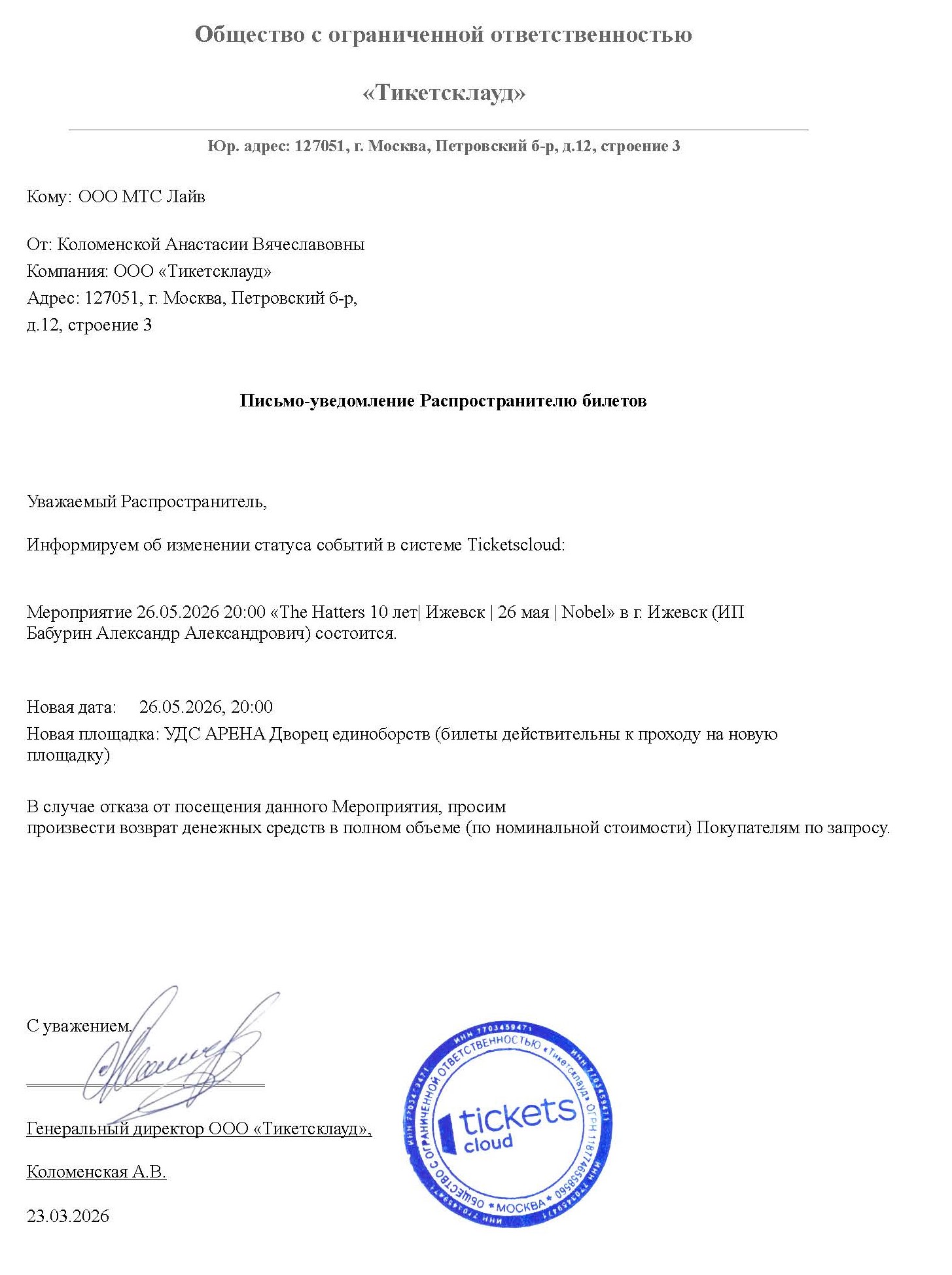 Уважаемый клиент! Спешим сообщить, что по информации, полученной от организатора, концерт группы «The Hatters», запланированный на 26 мая 2026 года в 20:00 в клубе «Nobel concert hall», перенесён на другую площадку. Новое место проведения концерта: УДС АРЕНА Дворец единоборств (г. Ижевск, просп. Конструктора Калашникова, 13/1). Ранее приобретенные билеты действительны на новую площадку, обменивать их не нужно. Если вам не удобно посетить концерт на новой площадке, вы можете вернуть билет по кнопке в личном кабинете во вкладке «Заказы». Деньги за электронные билеты вернутся автоматически в полном объёме на карту, с которой была произведена оплата. Если вы купили билет в кассе Ticketland.ru за наличный расчет, то обратитесь, пожалуйста, на почту: vozvrat@ticketland.ru. С уважением, команда поддержки Ticketland.