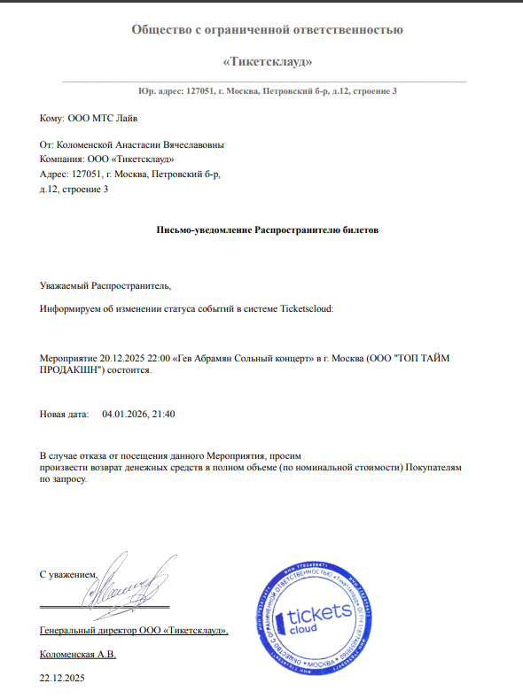 Уважаемый клиент! Спешим сообщить, что по информации, полученной от организатора, сольный концерт Гева Абрамяна, запланированный на 20.12.2025 в 22:00 в Coin Event Hall, переносится на 04.01.2026, 21:40. Ранее приобретенные билеты действительны, обменивать их не нужно. Если новые условия вас не устраивают, вы можете вернуть билет по кнопке в личном кабинете во вкладке «Заказы». Деньги за электронные билеты вернутся автоматически в полном объёме на карту, с которой была произведена оплата. Если вы купили билет в кассе Ticketland.ru за наличный расчет, то обратитесь, пожалуйста, на почту: vozvrat@ticketland.ru. С уважением, команда поддержки Ticketland.