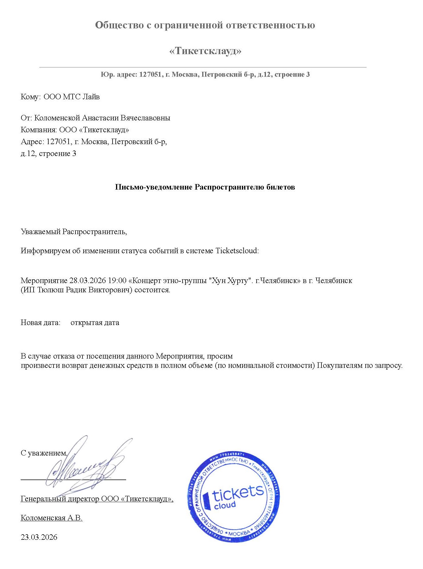 Уважаемый клиент! Спешим сообщить, что по информации, полученной от организатора, концерт этно-группы «Хун Хурту», запланированный на 28 марта 2026 года в 19:00 в Конгресс-холл Центр международной торговли, перенесён на открытую дату. Новая дата концерта будет объявлена дополнительно. Ранее приобретенные билеты действительны на новую дату, обменивать их не нужно. Если вам не удобно посетить концерт в новую дату, вы можете вернуть билет по кнопке в личном кабинете во вкладке «Заказы» (до 30 апреля 2026 года включительно). Деньги за электронные билеты вернутся автоматически в полном объёме на карту, с которой была произведена оплата. Если вы купили билет в кассе Ticketland.ru за наличный расчет, то обратитесь, пожалуйста, на почту: vozvrat@ticketland.ru. С уважением, команда поддержки Ticketland.
