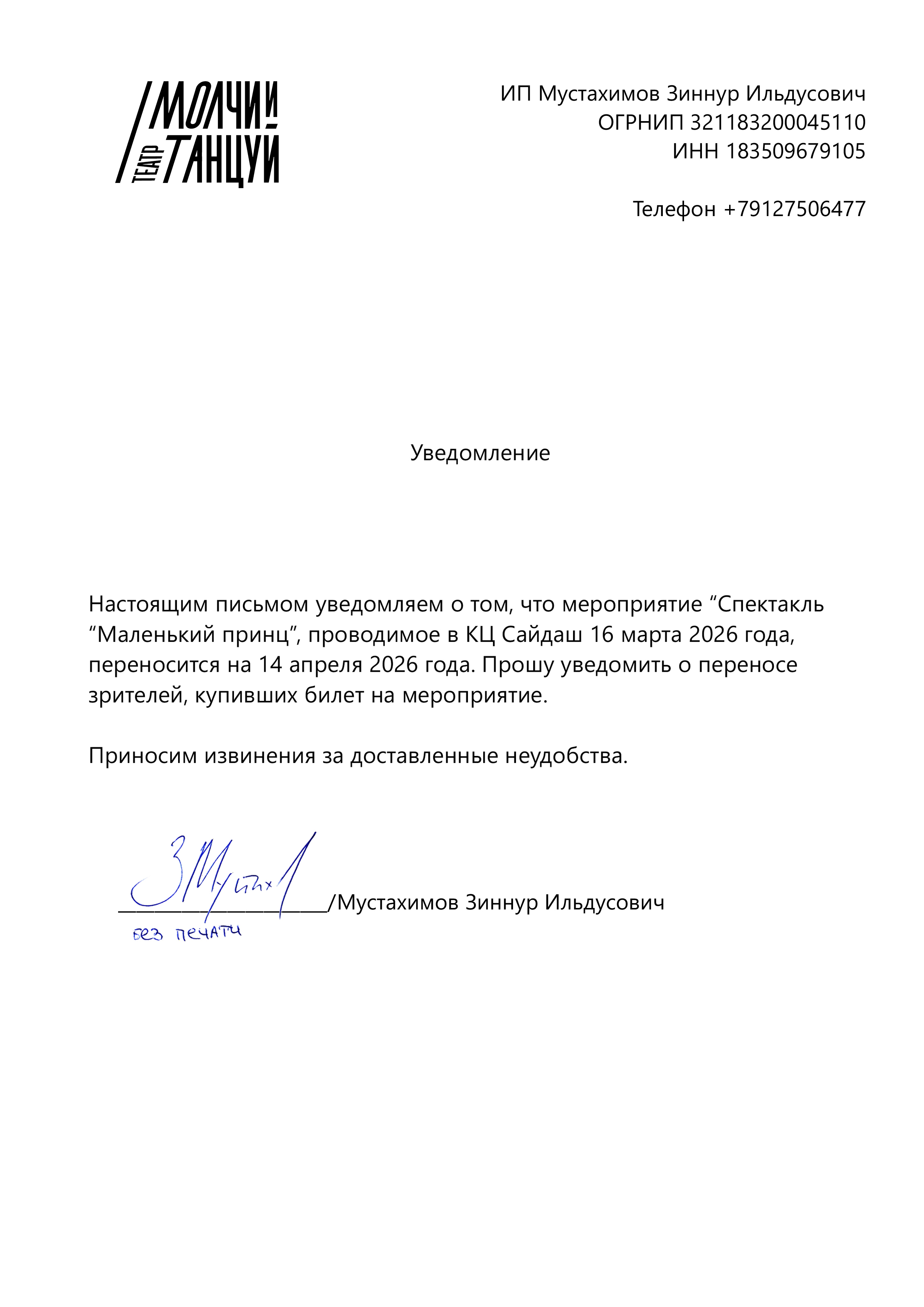 Уважаемый клиент! Спешим сообщить, что по информации, полученной от организатора, спектакль «Маленький принц», ранее запланированный на 16 марта 2026 года (перенос с 31 октября 2025 года) в КЦ «Сайдаш», перенесён на 14 апреля 2026 года, начало в 19:00. Ранее приобретенные билеты действительны, обменивать их не нужно. Если вам не удобно посетить спектакль, вы можете вернуть билет по кнопке в личном кабинете во вкладке «Заказы» (до 14.04.2026 19:00). Деньги за электронные билеты вернутся автоматически в полном объёме на карту, с которой была произведена оплата. Если вы купили билет в кассе Ticketland.ru за наличный расчет или оплатили подарочной картой, то обратитесь, пожалуйста, на почту: vozvrat@ticketland.ru. С уважением, команда поддержки Ticketland.
