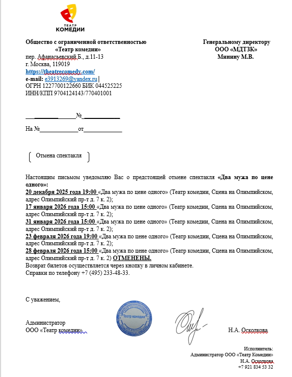 Уважаемый клиент! Спешим сообщить, что по информации, полученной от организатора, спектакль «Два мужа по цене одного», запланированный на20 декабря 2025 года 19:00, 17 января 2026 года 15:00, 31 января 2026 года 15:00, 23 февраля 2026 года 19:00 и 28 февраля 2026 года 15:00 в Театре Комедии (сцена на Олимпийском), отменён. Деньги за электронные билеты вернутся автоматически в полном объёме на карту, с которой была произведена оплата. Если вы купили билет в кассе Ticketland.ru за наличный расчет, то обратитесь, пожалуйста, на почту: vozvrat@ticketland.ru. С уважением, команда поддержки Ticketland