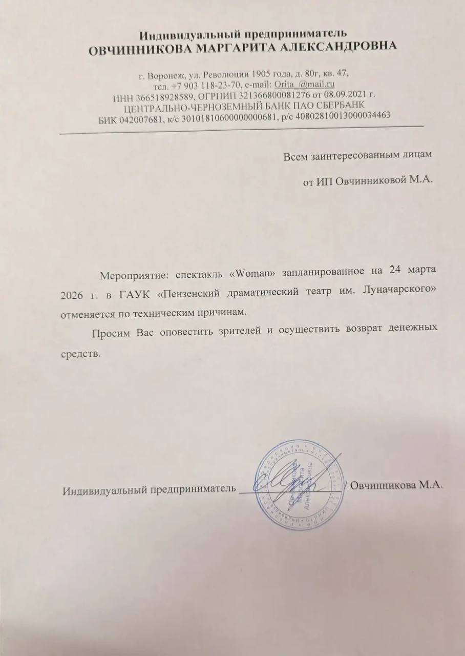 Уважаемый клиент! Спешим сообщить, что по информации, полученной от организатора, спектакль Ток - шоу «Woman», запланированный на 24 марта 2026 года в 19:00 в Пензенском областном драматическом театре, отменен. Деньги за электронные билеты вернутся автоматически в полном объёме на карту, с которой была произведена оплата. Если вы купили билет в кассе Ticketland.ru за наличный расчет или оплатили подарочной картой , то обратитесь, пожалуйста, на почту: vozvrat@ticketland.ru. С уважением, команда поддержки Ticketland
