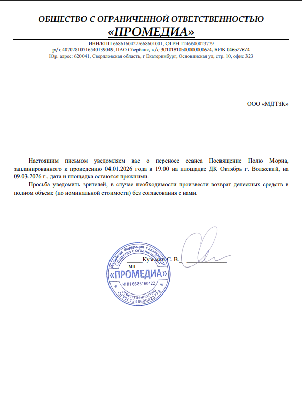 Уважаемый клиент! Спешим сообщить, что по информации, полученной от организатора, спектакль «Резиденция Деда Мороза» в дендросаду им. Г.И. Гензе. «Морозко», запланированный на 21.12.25г. в 17:00, переносится на 05.01.26г. в 17:00 в Областном дендрологическом саду. им. Гензе. Если дата не подходит, можно согласовать другую по номеру 20-90-26 или совершить полный возврат средств. Ранее приобретенные билеты действительны на новую дату, обменивать их не нужно. Если вы не хотите посетить спектакль, вы можете вернуть билет по кнопке в личном кабинете во вкладке «Заказы». Деньги за электронные билеты вернутся автоматически в полном объёме на карту, с которой была произведена оплата. Если вы купили билет в кассе Ticketland. ru за наличный расчет, то обратитесь, пожалуйста, на почту: vozvrat@ticketland.ru. С уважением, команда поддержки Ticketland.