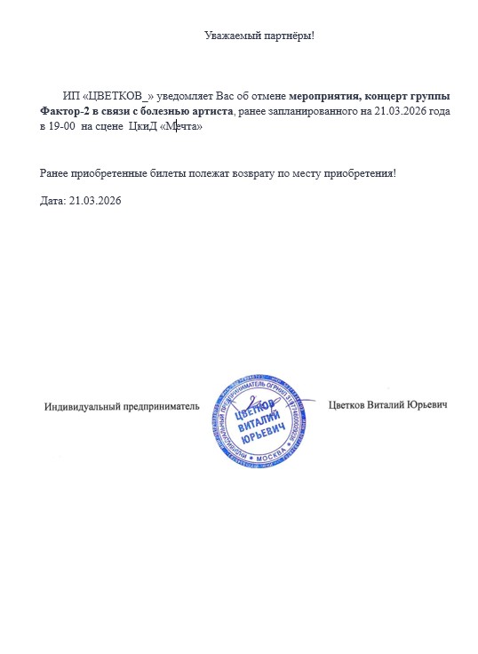 Уважаемый клиент! Спешим сообщить, что по информации, полученной от организатора, концерт группы «Фактор 2», запланированный на 21 марта 2026 года в ЦкиД «Мечта», отменен. Деньги за электронные билеты вернутся автоматически в полном объёме на карту, с которой была произведена оплата. Если вы купили билет в кассе Ticketland.ru за наличный расчет или оплатили подарочной картой , то обратитесь, пожалуйста, на почту: vozvrat@ticketland.ru. С уважением, команда поддержки Ticketland